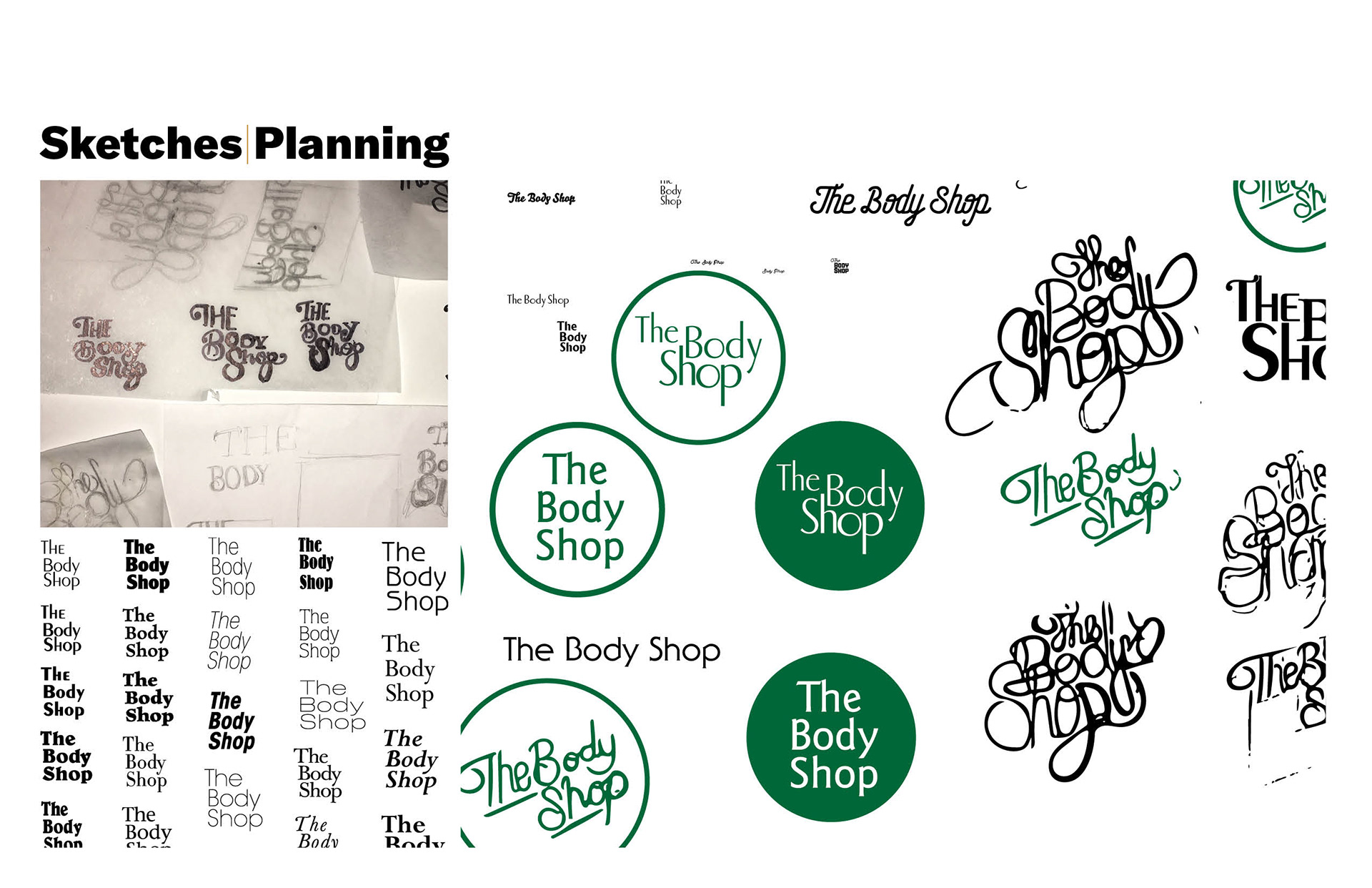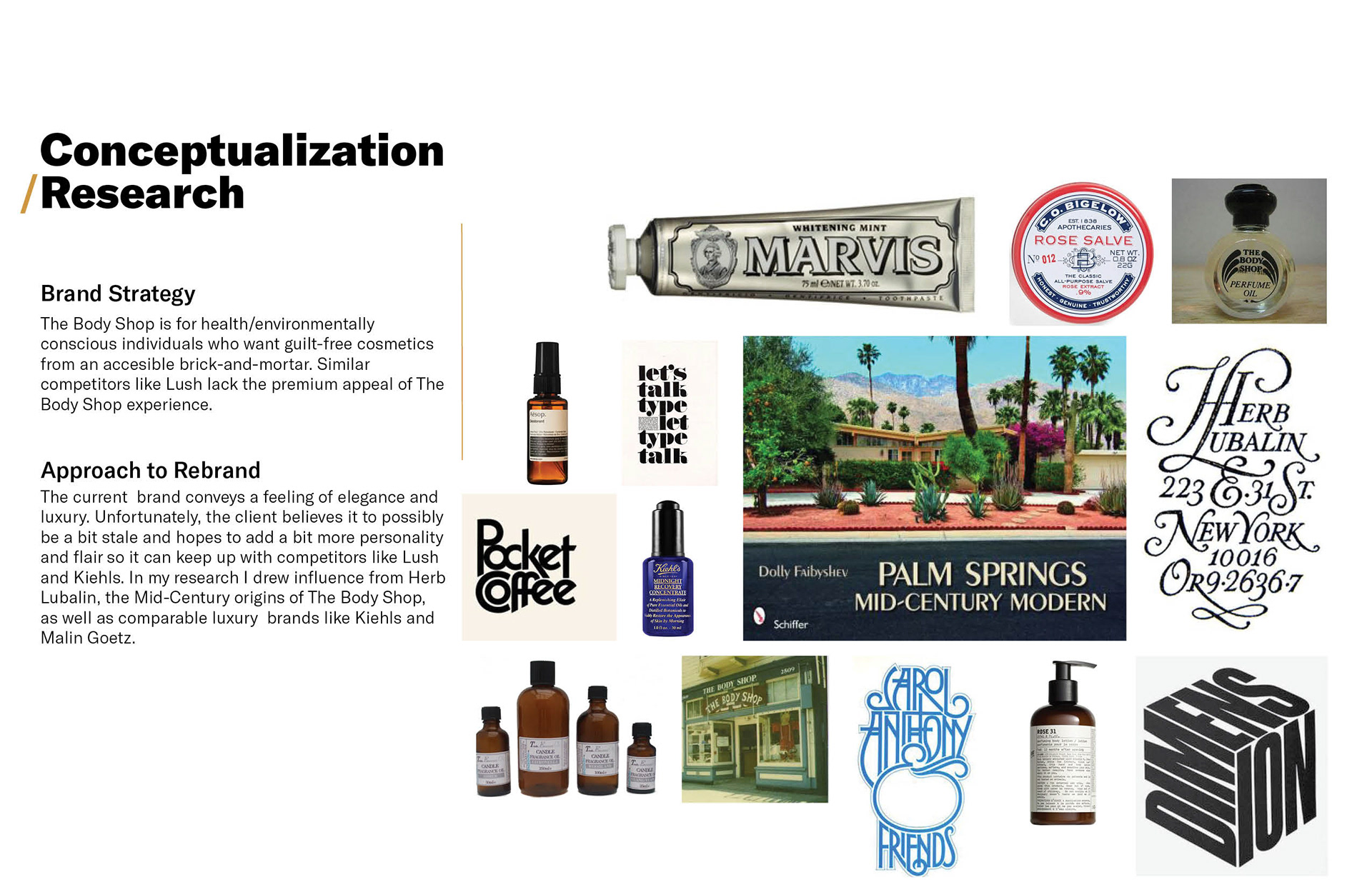 A tentative rebrand of The Body Shop inspired by the brand's beginnings in Berkeley. Referencing mid-century design tropes and striving to find a balance between classic and modern.